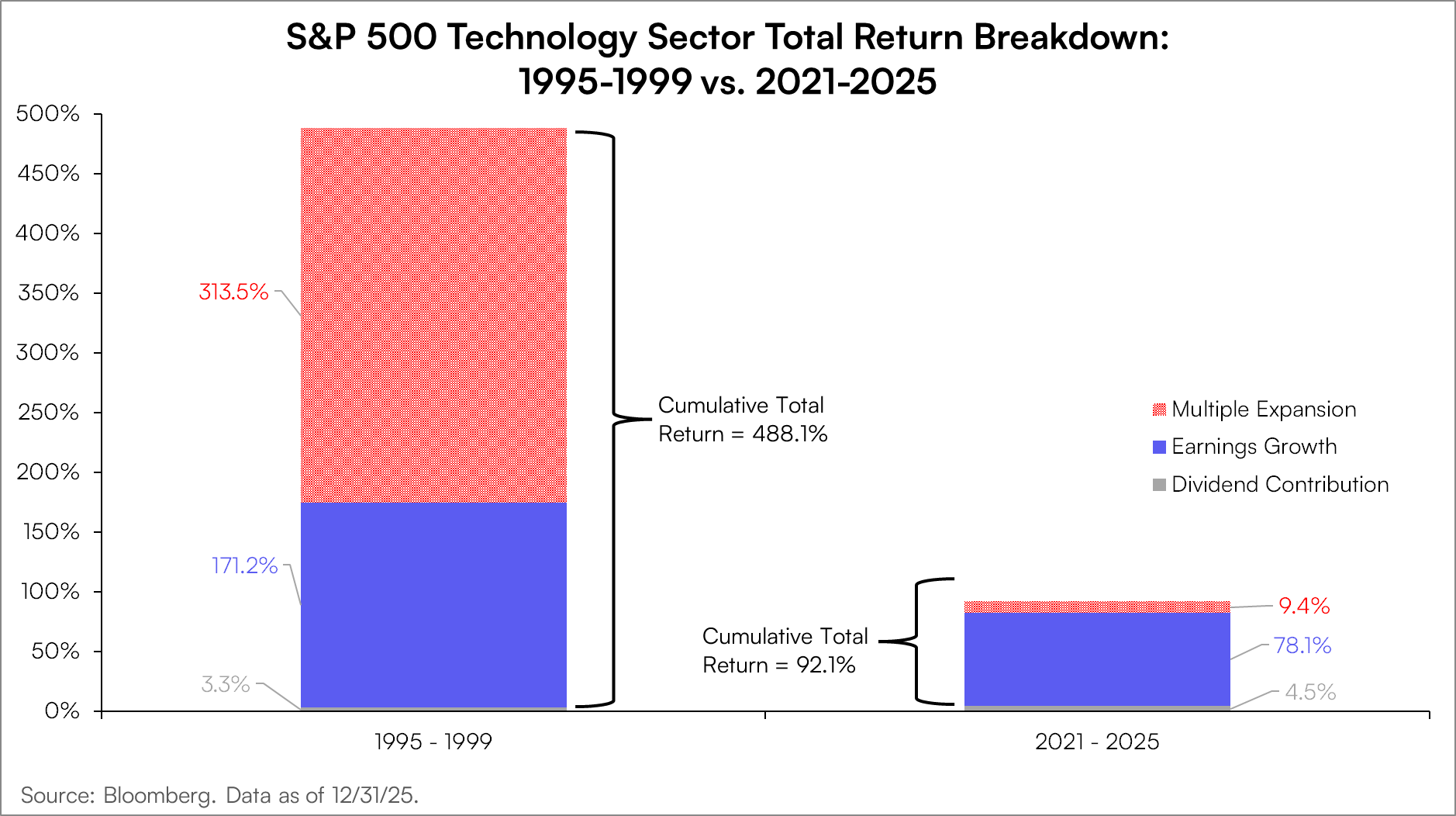 In the four year period from the end of 2021 to year-end 2025, the S&P 500 Technology sector is up 92% on a total return basis, with 78% of the return coming from earnings growth, 5% from dividends, and 9% from multiple expansion. This is not to say that there are not frothier corners of the market, but to highlight that on the aggregate, the today’s extremes are well short of the dotcom era comparisons.