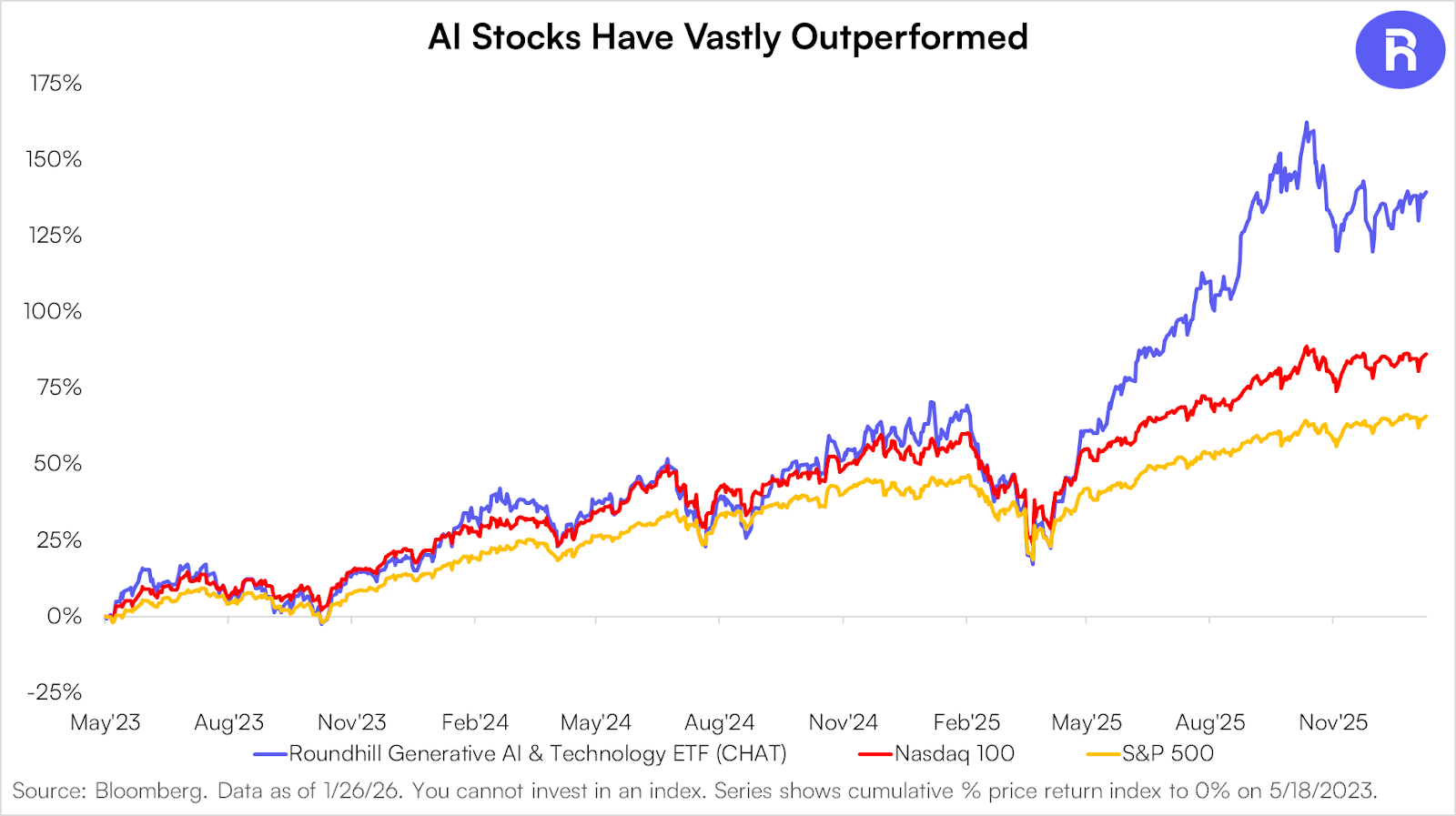 *You cannot invest in an index. The performance data quoted represents past performance. Past performance does not guarantee future results. Current performance may be lower or higher than the performance data quoted. The investment return and principal value of an investment will fluctuate so that an investor's shares, when sold or redeemed, may be worth more or less than their original cost. Returns less than one year are not annualized. For the most recent month-end performance, please call (855) 561-5728. For more information, including current holdings and standardized performance: https://www.roundhillinvestments.com/etf/chat/