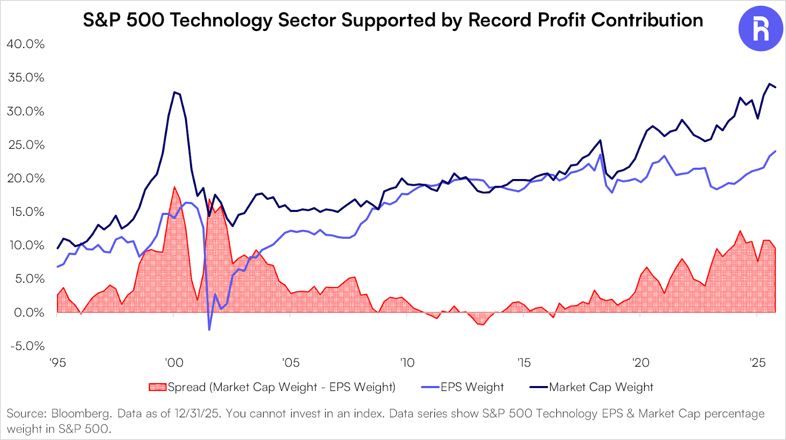 Today, AI is once again driving the Technology sector to record price levels, but with its share of total S&P 500 profits at historic highs (~20%). The disparity between market cap weight and earnings weight is much less than it was in March of 2000.
