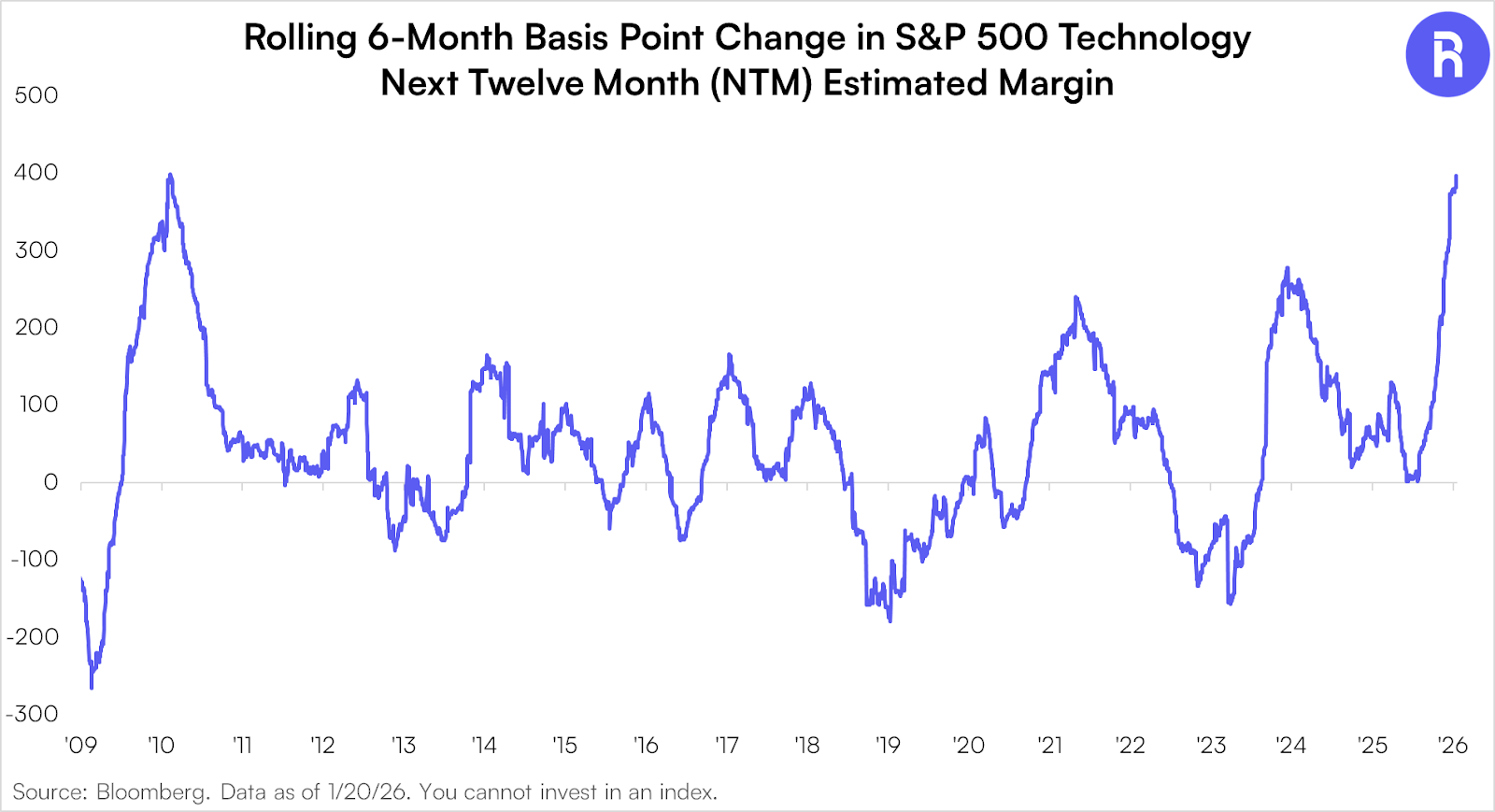 Margin expansion has been a fundamental boon for generative AI stocks specifically and the Technology sector broadly. Currently, one year forward estimated margins for the S&P 500 Technology sector are at record levels, while the six month revisions in those estimates are comparable to changes last seen following the 2009 market low.