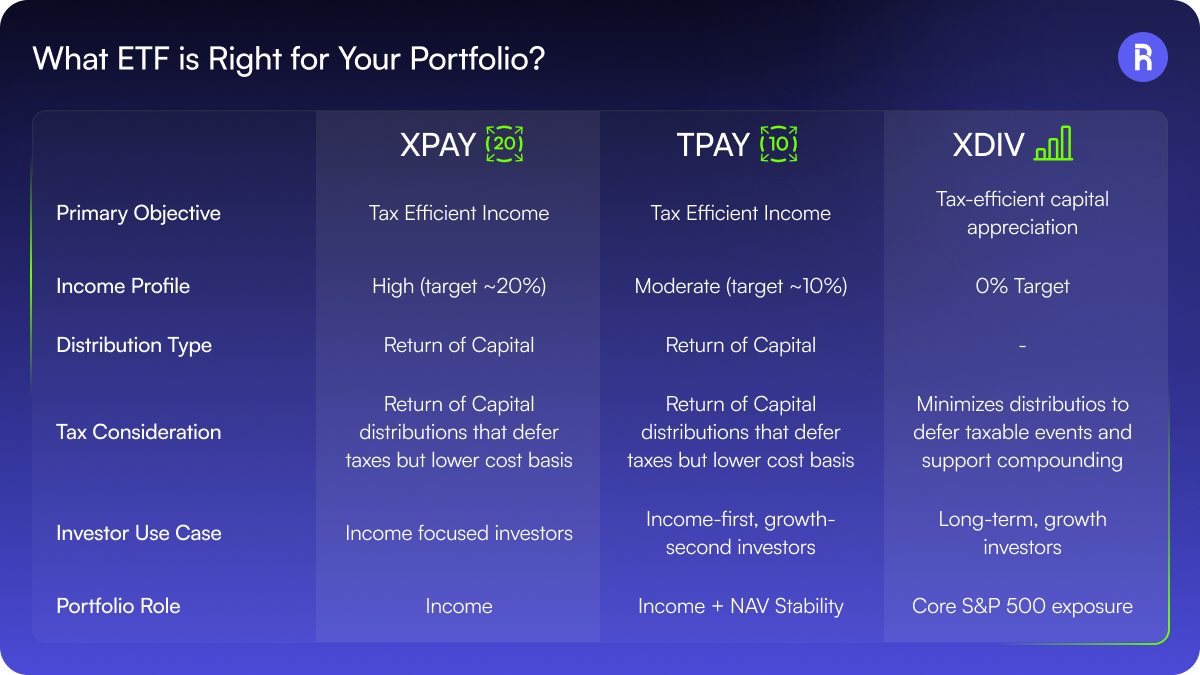 For investors prioritizing elevated, consistent distributions, XPAY offers a higher income profile with a more aggressive tradeoff. For those seeking income with a greater emphasis on stability, TPAY provides a more balanced approach. And for investors focused on long-term capital appreciation, XDIV offers a way to remain fully invested while minimizing taxable distributions.